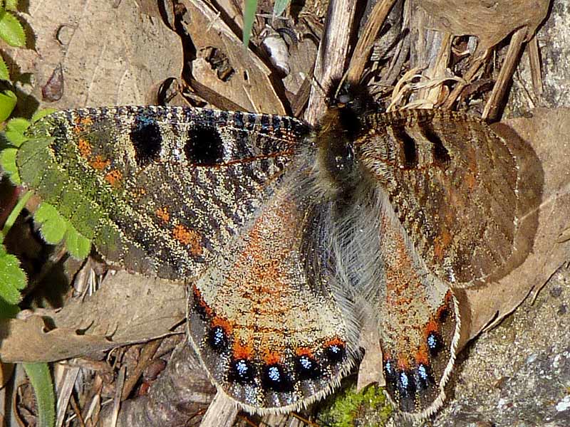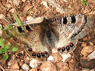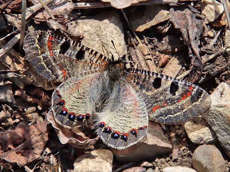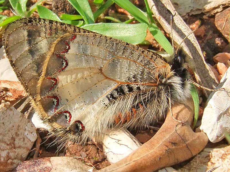 | Im umgepflügten Ackerland legen sich die Falter (rechts das buntere Weibchen) zur Paarung gerne auf den Boden (April/Mai 1992, Westtürkei, Foto: Jürgen Hensle) |