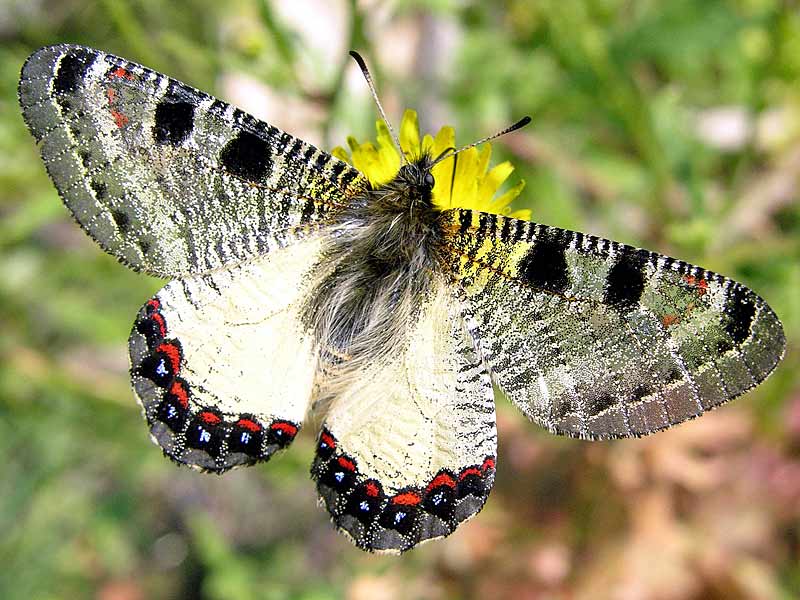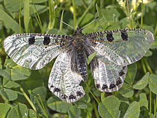| Ähnliche Arten: | Der hyaline Falter kann kaum mit einer anderen Art verwechselt werden. Raupen denen die weißen Punkte fehlen, ähneln denen des Apollos. |
