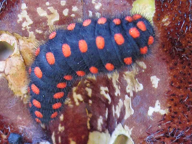 | Wissenswertes: | Die jüngeren Raupen spinnen sich - oft zu mehreren - in eine Blatttüte oder Blüte ein. Die erwachsene Raupe lebt offen an der Pflanze und warnt ihre Fressfeinde durch die auffällige Färbung vor ihrer Giftigkeit. |