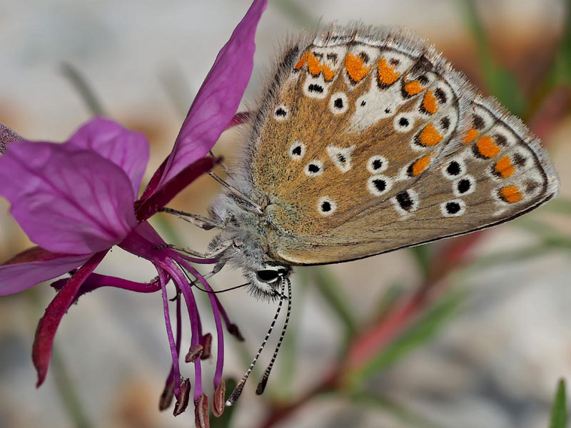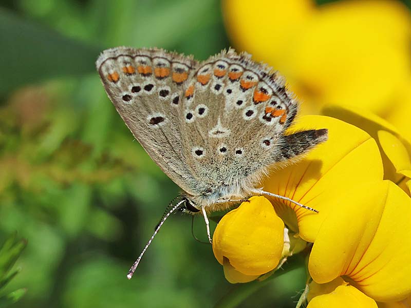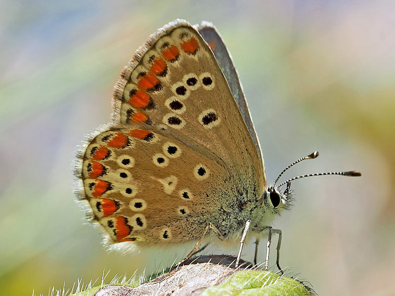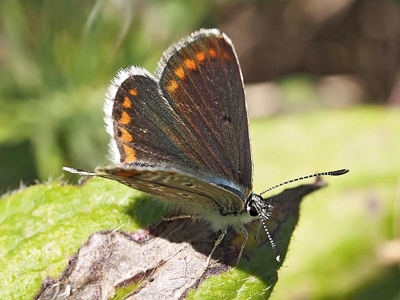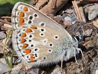 | Dieser Falter stammt vom Südrand der Mittleren Schwäbischen Alb. Im Grundlagenwerk "Die Schmetterlinge Baden-Württembergs (EBERT(Hrsg.), Band 2)" wurde vermutet, dass von den beiden Zwillingsarten "A.artaxerxes" und "A.agestis" in diesem Gebiet nur die erstere vorkommt (der Fundort "Langes Tal" wird dort für A.artaxerxes explizit genannt) - dies ist inzwischen zweifelhaft. Die starke Reduzierung der orangen Flecken deutet aber auf A.artaxerxes hin - letzte Sicherheit gibt es aber nicht. | Gleicher Falter wie links (D, Schwäbische Alb, Machtolsheim, Langes Tal,19.6.2006) |