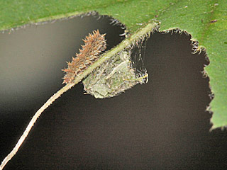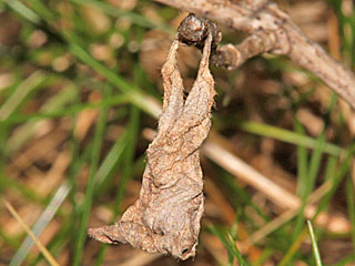 Oben : Diese Freilandpuppe fand Dorothee Hohler im Juni 2004 am nördlichen Rand der Schwäbischen Alb bei Aichelberg. Oben links : Puppe Links : Raupe zur Verpuppung aufgehängt (D, Bayern, Penzberg, 13.5.2018 Gerd Rose |