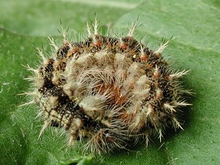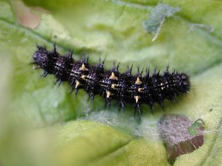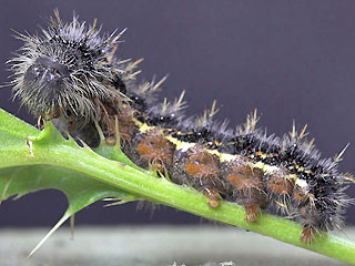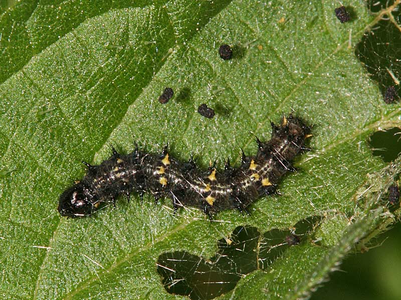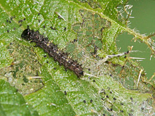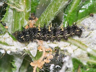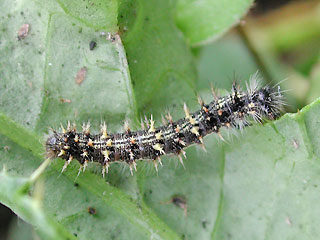 Diese Raupe - gefunden relativ spät im Jahr - könnte man leicht mit einer Admiralsraupe verwechseln. Die Zucht ergab den im Bild rechts gezeigten (schlüpfenden) Falter (24.9.2007, D, 52222 Stolberg/Rheinland , Bild Susan Fröschen) | Dieser Falter schlüpfte aus der Raupe links (05.10.2007, D, 52222 Stolberg/Rheinland , Bild Susan Fröschen) |