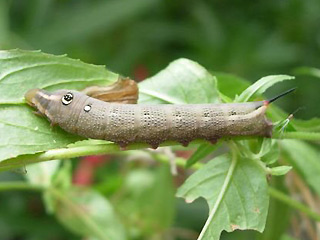 | Ähnliche Arten: | Der Falter ist meist sicher zu bestimmen, die Raupe hat viel Ähnlichkeit mit der des Oleanderschwärmers. Dagegen besteht wenig Ähnlichkeit mit den beiden bei uns heimischen Weinschwärmerarten ( Kleiner und Mittlerer Weinschwärmer). Im südlichen Spanien taucht als Wanderfalter selten die recht ähnliche Art Hippotion osiris auf (deren Raupe soll ein sehr kleines Horn besitzen). In Griechenland (auch Inseln, z.B. Samos) kann der "Orientalische Weinschwärmer" angetroffen werden, dessen Raupen sehr ähnlich aussehen. |