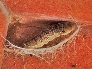 Die 3 Bilder oben und links verdanke ich Reinhard Lobeck. Er fand und fotografierte eine Raupe, die gerade dabei war sich einzuspinnen (Lanzarote, 4.10.2014, Bild hier ). Er überließ mir die Puppe, der Falter schlüpfte dann am 9.11.2014. Ein Belegfoto dieses Falter findet man hier ! |