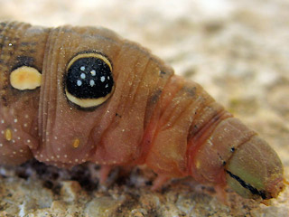 | Die 4 Bilder oben zeigen noch nicht erwachsene Raupen in zwei Farbvarianten (Bilder: Markus Thiery) | Markus Thiery fand Raupen in jeweils verschiedenen Größen (2,5cm - 6cm) auf Weinpflanzen von August 2006 bis Ende November2006 (Kanarische Inseln, Lanzarote, Costa Teguise) |