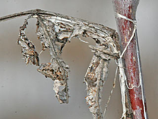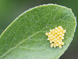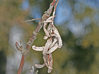 (Schweiz, Tessin, Maggiatal, Avegno, 23.4.2006) Oben links : Im Sommer angefertigtes Überwinterungsgespinst (Zuchtfoto) Links : Eiablage an Zierquitte (Chaenomelas speciosa) (D, Niedersachsen, Umgebung Goslar, Langelsheim, 6.6.2016) Jan Kring |