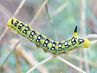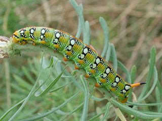 kann aber auch am Tage beobachtet werden. Oben links : Das Spektakulärste beim Wolfsmilchschwärmer ist sicherlich die sehr auffällige, an Wolfsmilcharten fressende Raupe. Sie wird häufiger als der Falter gefunden. Links : Erwachsene Raupe (Schweiz, Unterengadin, Guarda, 2.9.2009) |