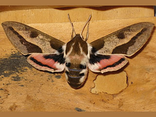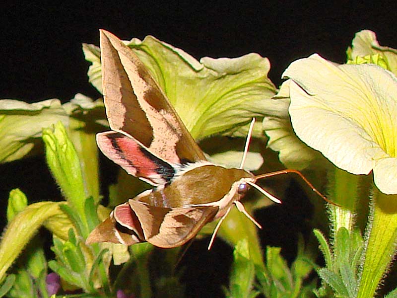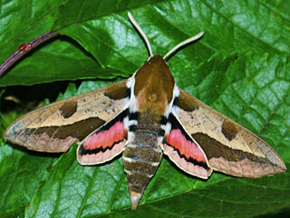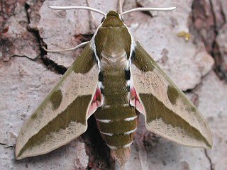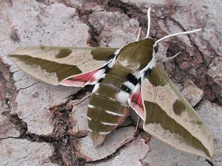 Schwärmer: | Die Familie der Schwärmer spielt eine besondere Rolle unter den Nachtfaltern. Es sind meist sehr große Falter mit dickem Körper, die oft kolibriartig im Schwirrflug vor Blüten stehend beobachtet werden. Beim Wolfsmilchschwärmer geschieht dies vor allem in der Dämmerung. Wenn man geeignete Pflanzen (Geißblatt (Lonicera spec.), Nachtkerzen (Oenothera spec.), Seifenkraut (Saponaria spec.), Phlox (Phlox paniculata), ...) im Garten hat, bekommt man sie am ehesten zu Gesicht. Häufiger als die Falter findet man die großen Raupen, die meist am Körperende eine Art Stachel (völlig ungefährlich!) haben. |