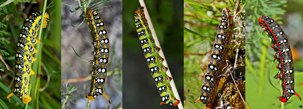Raupen: | Die spektakulär gefärbten Raupen sind unverwechselbar. Sie fressen an Wolfsmilcharten (Euphorbia spec.), vor allem an Zypressen-Wolfsmilch (Euphorbia cyparissias). |