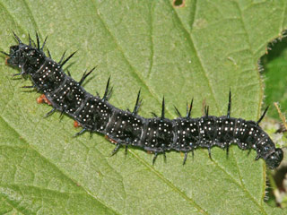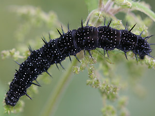 | Erwachsene Raupe - erkennbar an samtschwarzer Zeichnung mit weißen Punkten, Stacheln und rötlichen Bauchfüßen. | Die frisch geschlüpften Räupchen bauen schnell ein Gespinst, auf bzw. in dem sie sich aufhalten. |