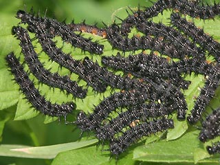 Halberwachsene Raupen (ca. 25mm lang), noch gesellig lebend. Von den Raupen des Landkärtchens unterscheiden sie sich vor allem durch die fehlenden "Kopfdornen". |