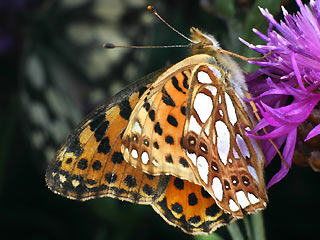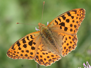 Linie (Bild von Walter Müller) Oben links : Bei dieser "Perlmutterfalter"-Art sind die perlmuttartigen, silbrig glänzenden Flecken besonders stark ausgebildet. Das Bild zeigt ein Weibchen auf der bei uns wichtigsten Eiablagepflanze Acker-Stiefmütterchen (Viola arvensis) (Schwäbische Alb, Ochsenwang, 7.9.2005) Links : D, BW, Schwäbische Alb, Ochsenwang, Breitenstein, 21.9.2016 |
