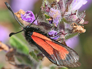 | Raupenfutterpflanzen: | Z. purpuralis: Thymian (Thymus spec.) Z. minos: Kleine Bibernelle (Pimpinella saxifraga)  |