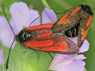 | Verbreitung/ Biotop/ Flugzeit: | Beide Arten haben eine ähnliche Verbreitung, die sich von Mitteleuropa ostwärts, auch über den Balkan erstreckt. Im Unterschied zu Z. purpuralis ist Z. minos aber z.B. in der Südschweiz und in Italien kaum vertreten. Als Lebensraum dienen eher warme, magere Bereiche mit Vorkommen der Raupenfutterpflanzen. Die Arten fliegen in Mitteleuropa von Ende Mai bis in den August hinein. |