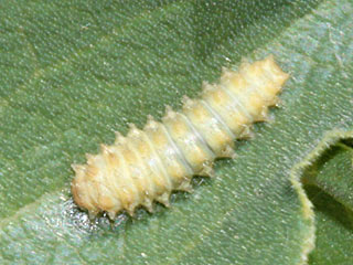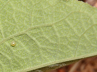 abgelegtes Ei, das geschlüpfte Eiräupchen (2.6.2010) sowie links die Jungraupe (13.6.2010) |