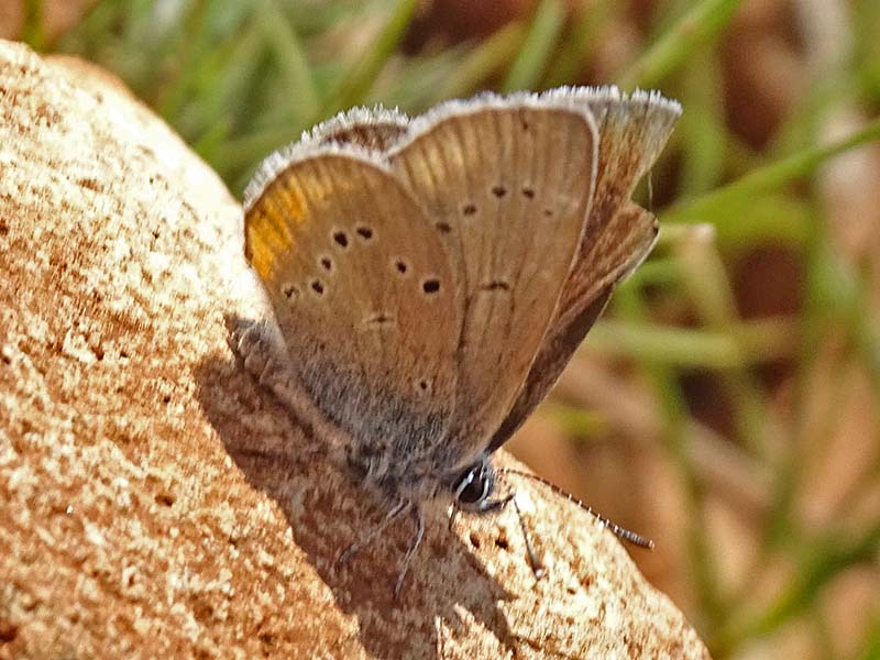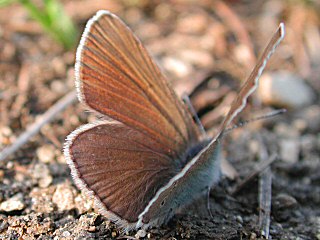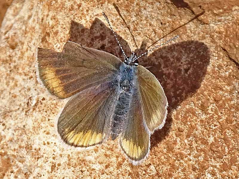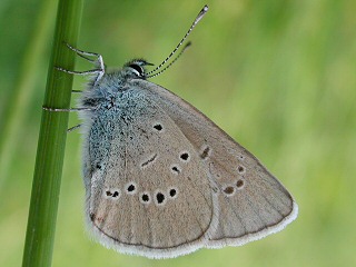 Ochsenwang, 25.9.2005) Oben links : Bestes Erkennungszeichen der Art in beiden Geschlechtern ist die graubraune, zeichnungsarme Unterseite. Links : Hier befindet sich der Falter rechts neben 2 Exemparen des in Mitteleuropa recht häufigen Hauhechelbläulings (D, BW, Kircheim unter Teck, 22.7.2012 Daniela Graf) |