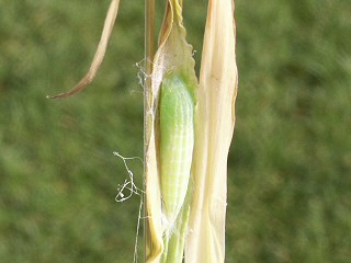 Unterseite des braunkolbigen Braun-Dickkopffalters. Die Hinterflügel besitzen im körpernahen Bereich einen deutlichen orangen Streifen | Dieses Raupenbild des schwarzkolbigen Braun-Dickkopffalters hat mir Sybille Przybilla zur Verfügung gestellt. Man beachte den längsgestreiften Kopf (Th. sylvestris hat einen einfarbig grünen Kopf). |