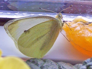 Welz zeigt eine solche Fütterung ! Man kann auch versuchen, den Schmetterling mit einer saftigen Frucht zu füttern. Die folgenden Bilder zeigen, wie ein Schwalbenschwanz mit einer Kiwi ( Bild ) bzw. ein Kleiner Kohlweißling mit einer zerdrückten Mandarine ( Bild ) bzw. ein Großer Fuchs auf einer Orange ( Bild ) bzw. eine Baumwolleule mit Bananen/Orangensaftgemisch ( Bild ) gefüttert wird. Ebenso bestens geeignet : Melone oder zerdrückte Trauben. Zwischen den Fütterungen sollte man den Falter dunkel und kühl halten (es geht auch der Kühlschrank bei 8 - 10 Grad) Nicole Schenk gelang es so, eine Baumwolleule über einen Monat am Leben zu erhalten ( "Gefüttert habe ich ihn, indem ich z.B. auf einen Löffel eine Traube ausgedrückt habe (od. Orange od. Kiwi), einen Tropfen Honig.. das Ganze vermischt und dann vor seinen Kopf gehalten habe") |