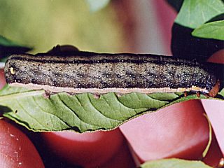Raupenbild von Marcella Hemkes - die Raupe ist sehr variabel, charakteristisch sind die beiden gelben Punkte auf dem hintersten Segment. |