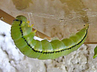 | Zur Verpuppung aufgehängte Raupe (Ägypten, ca.35km nordwestlich Kairo, Zucht Nov./Dez.2009 Gudrun Fetouh ) | |