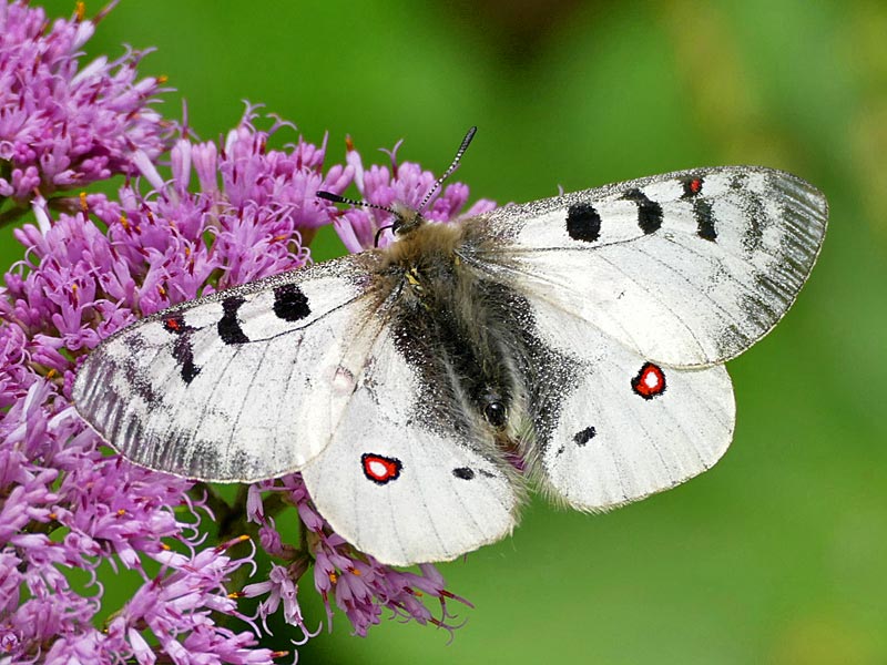 | Ähnliche Arten : | Die Unterscheidung zum Apollofalter ist manchmal gar nicht so leicht: Auf das Unterscheidungsmerkmal "Fühler" wurde oben schon hingewiesen. Außerdem besitzt der Hochalpen-Apollo am Vorderflügelrand oft einen roten Fleck, der beim Apollofalter in der Regel schwarz gefärbt ist. Auch die Höhenlage und das Biotop kann als Indiz gewertet werden. |